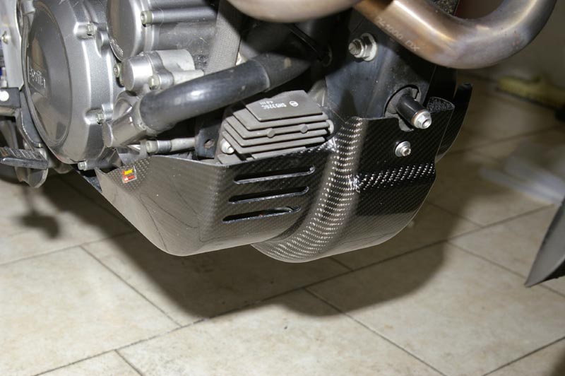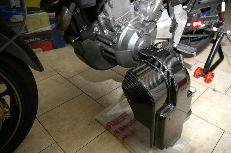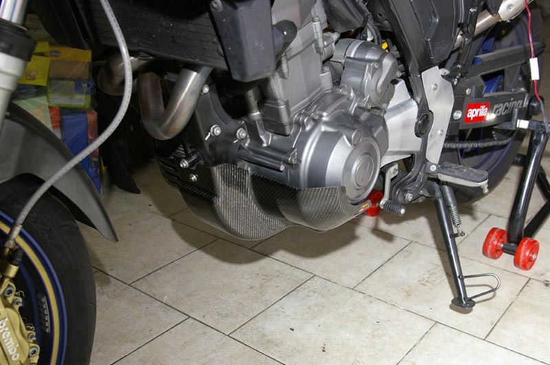 Il montaggio non e' stato privo di bestemmie. I fori sul carbonio per il fissaggio inferiore non sono perfetti e vanno allargati. Una volta infilate le due viti inferiori, l'occhiello metallico e il tubo di sfiato nel foro del paramotore, bisogna fissare la vite anteriore. E, a causa del tampone infilato nella testa della vite pompa acqua, bisogna forzare parecchio per far combaciare il foro del paramotore con quello sul telaio.